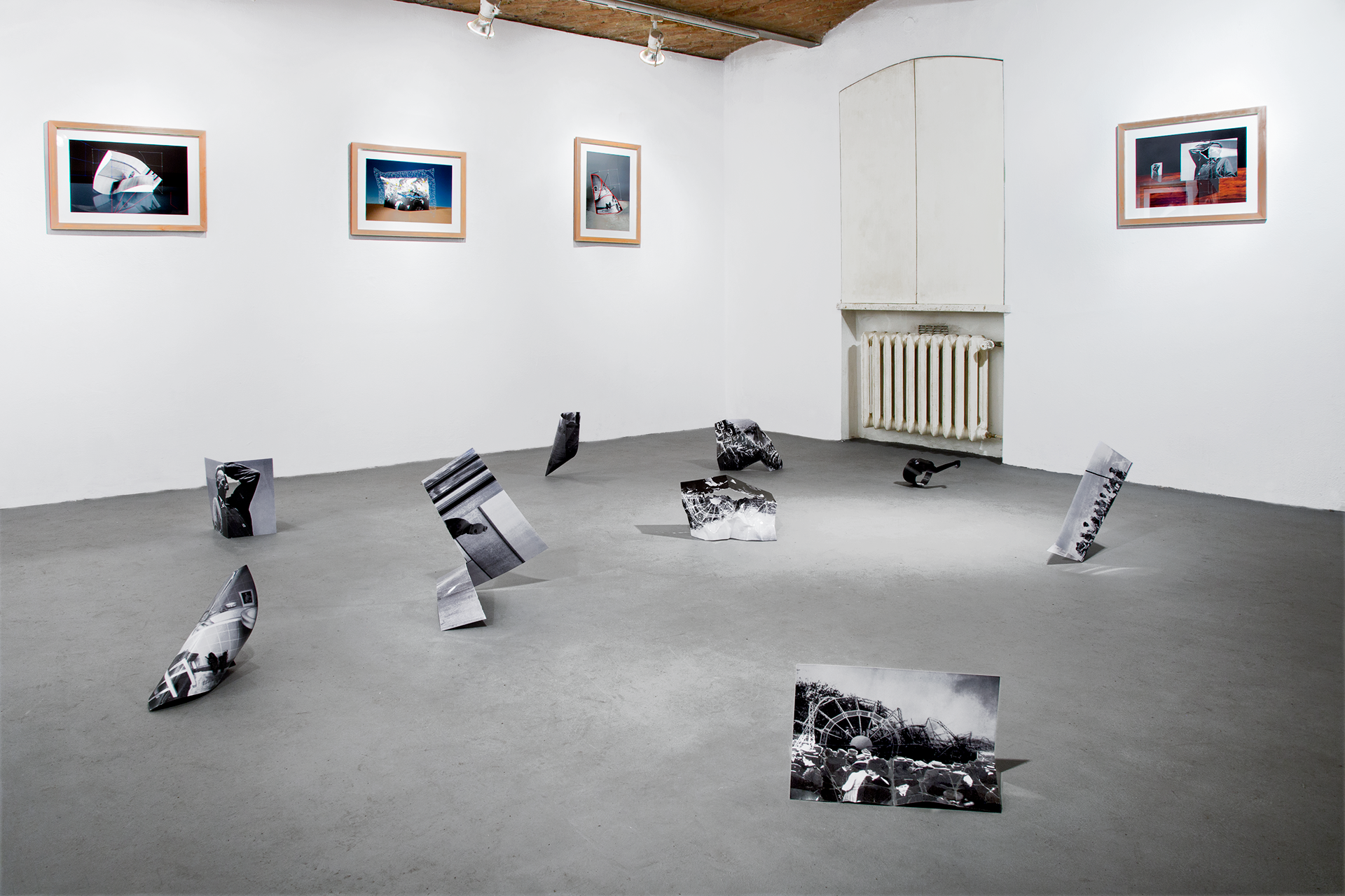 2. an installation featuring equipment from a photographer's workshop, including a camera and lighting setup, aimed at an effigy of the artist seemingly running away from the arrangement.